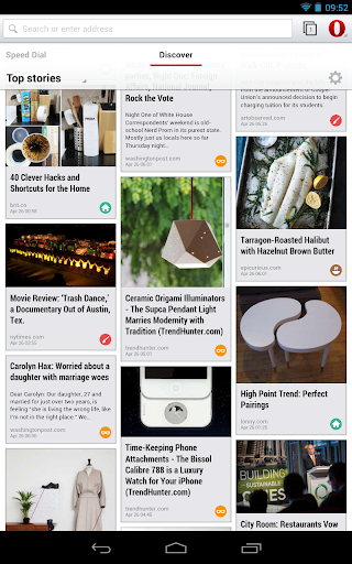 - Высокая производительность и отзывчивость. Браузер мгновенно реагирует на все действия пользователя и, по заявлению разработчиков, опережает по скорости существующие браузеры для платформы Android. Для ускорения работы на низкоскоростных каналах связи или при необходимости экономить трафик, предусмотрен режим Off-Road, при котором активируется ранее используемая в Opera Mini технология обработки контента на стороне серверной инфраструктуры Opera Software с передачей данных клиенту в сжатом виде, что позволяет снизить трафик и обеспечить комфортную работу при роуминге или при работы в 2G-сетях;