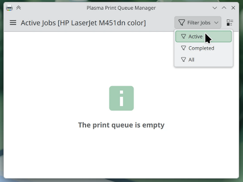 - Старый диалог для управления очередью вывода на печать заменён на вызов отдельного приложения plasma-print-queue, позволяющего наглядно управлять несколькими очередями для разных локальных или внешних принтеров.