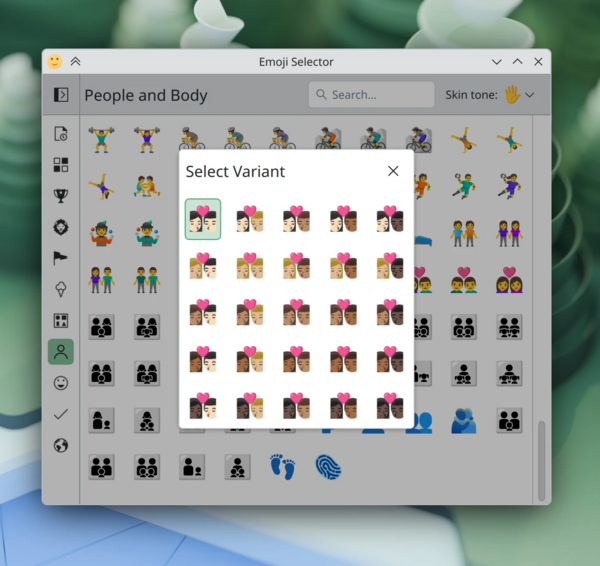 - В интерфейсе выбора Emoji варианты значков с разным цветом кожи сгруппированы в отдельный всплывающий диалог.