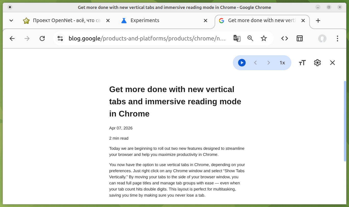 Релиз Chrome 147 с поддержкой вертикальных вкладок и переделанным режимом чтения